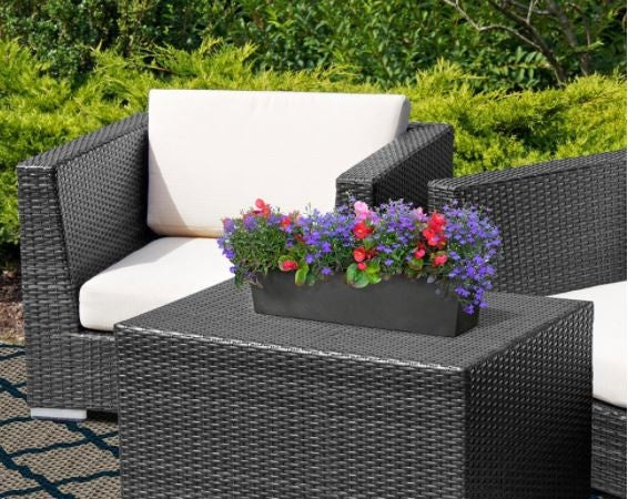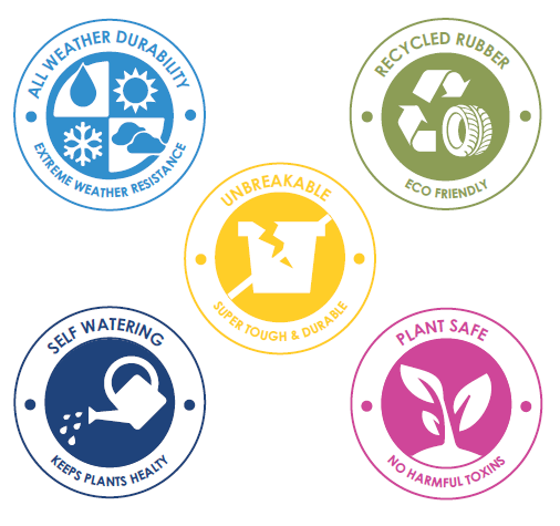 Recycled rubber planter|Eco-friendly|Self-watering system included|Durable|Weather resistant |Frost proof|Indoor and outdoor use|Won't fade, rot or crack